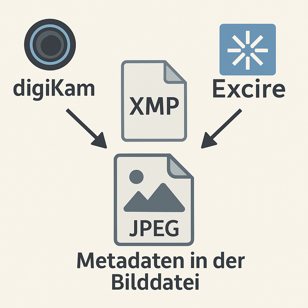 DigiKam und Excire ergänzen sich ideal im Metadaten-Workflow: Excire generiert KI-Bewertungen und Stichwörter als XMP, DigiKam liest sie ein und bettet sie regelmäßig in Bilddateien ein – für ein dauerhaft portables, datenbankunabhängiges Archiv.
