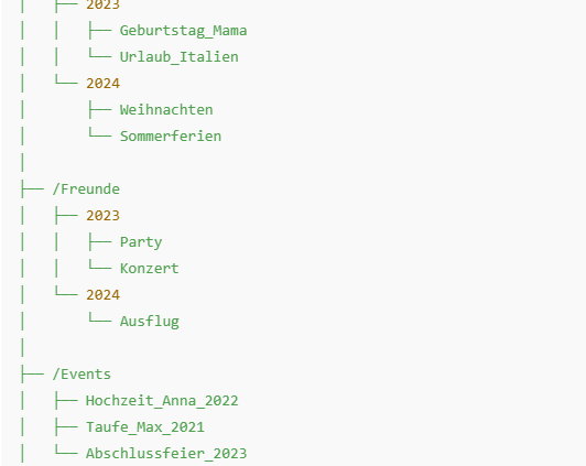 Ordnernamen enthalten keine inhaltlichen Detailinformationen (Ort, Personen, Anlässe). Diese Informationen werden in Metadatenfeldern der Dateien selbst festgehalten.